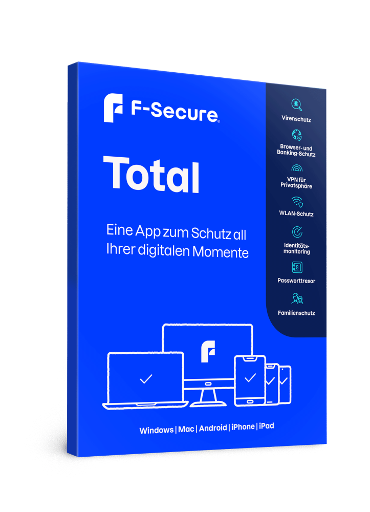 Schützen Sie Ihre Online-Aktivitäten und Ihre Privatsphäre. F-Secure TOTAL ist ein vollumfassendes Premiumpaket für Sicherheit im Internet. Es vereint Internetsicherheit der Spitzenklasse mit VPN, Online-Identitätsschutz und einem benutzerfreundlichen Passwortmanager. Schützen Sie Ihre Familie und Ihre Geräte mit einem einzigen Abonnement.